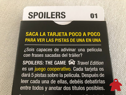 SPOILERS THE GAME TRAVEL EDITION es un juego cooperativo de Manu Palau editado por BrainPicnic y Zacatrus en el que tendremos que adivinar el nombre de una película de gran éxito y repercusión. Disponemos a modo de pistas 5 frases que se citan textualmente en el tráiler de estos taquillazos. Cuanto antes la adivinemos más estrellas conseguiremos.