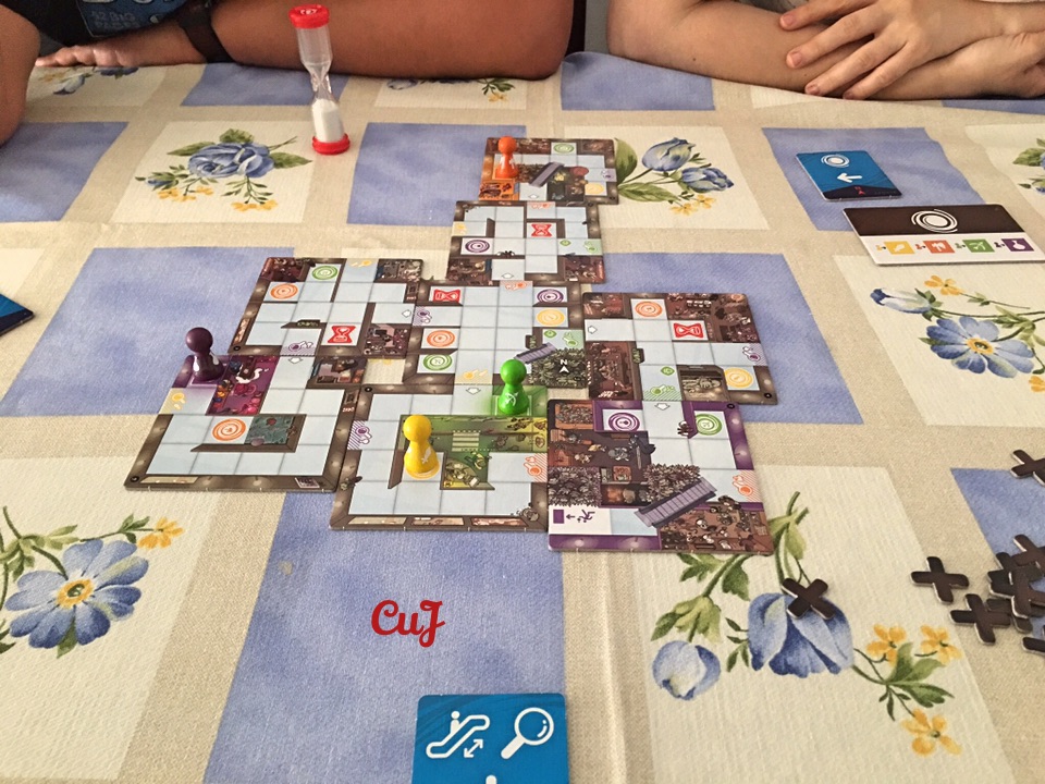 Todos los jugadores podemos mover a todos los héroes, pero sólo haciendo los movimientos que nos correspondan, (cada jugador tendrá una loseta que le indica las acciones que puede hacer), con la particularidad de que tendremos que hacerlo en menos de tres minutos, (Magic Maze es un juego en tiempo real), y… ¡en silencio! No podremos llamar la atención del resto de jugadores para que hagan una acción, ni indicarles en el tablero lo que tienen que hacer. Sólo les podremos mirar fijamente o coger un tótem rojo que trae el juego y dar golpes en la zona de la mesa del jugador al que queremos llamar la atención para que espabile y haga su acción.