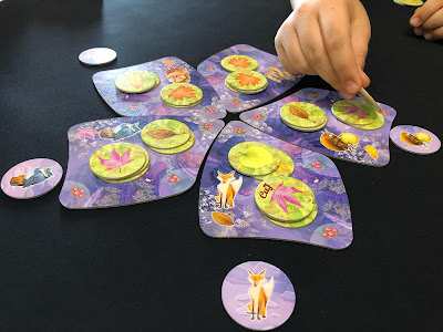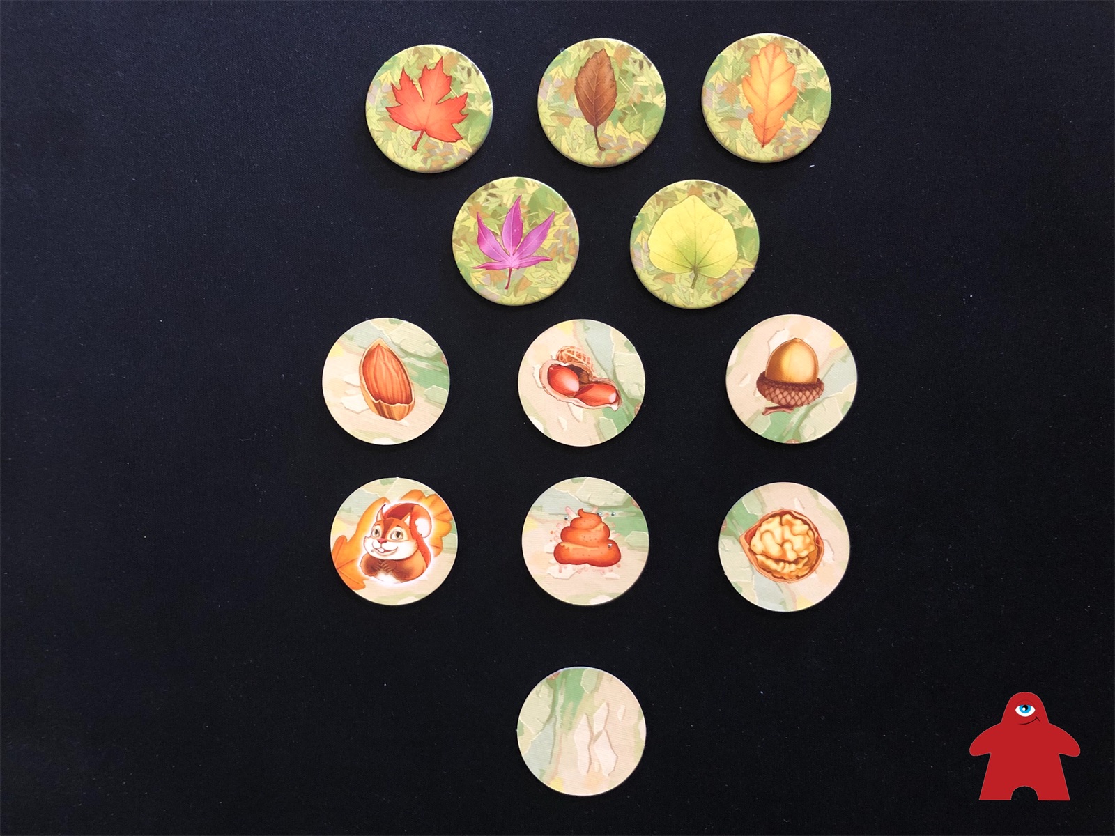 Fase 1. En el Otoño iremos colocando nuestras fichas de jugador con la parte de la hoja visible en los espacios que tenemos en el bosque. En nuestro turno colocaremos 1 y pasaremos el turno al siguiente. Antes de colocarla podemos ver en secreto el reverso de la ficha. Podemos poner nuestra ficha sobre otra colocada previamente, incluso si es de otro jugador. Una vez todos hayamos depositado nuestras fichas en el bosque pasaremos a la siguiente fase.