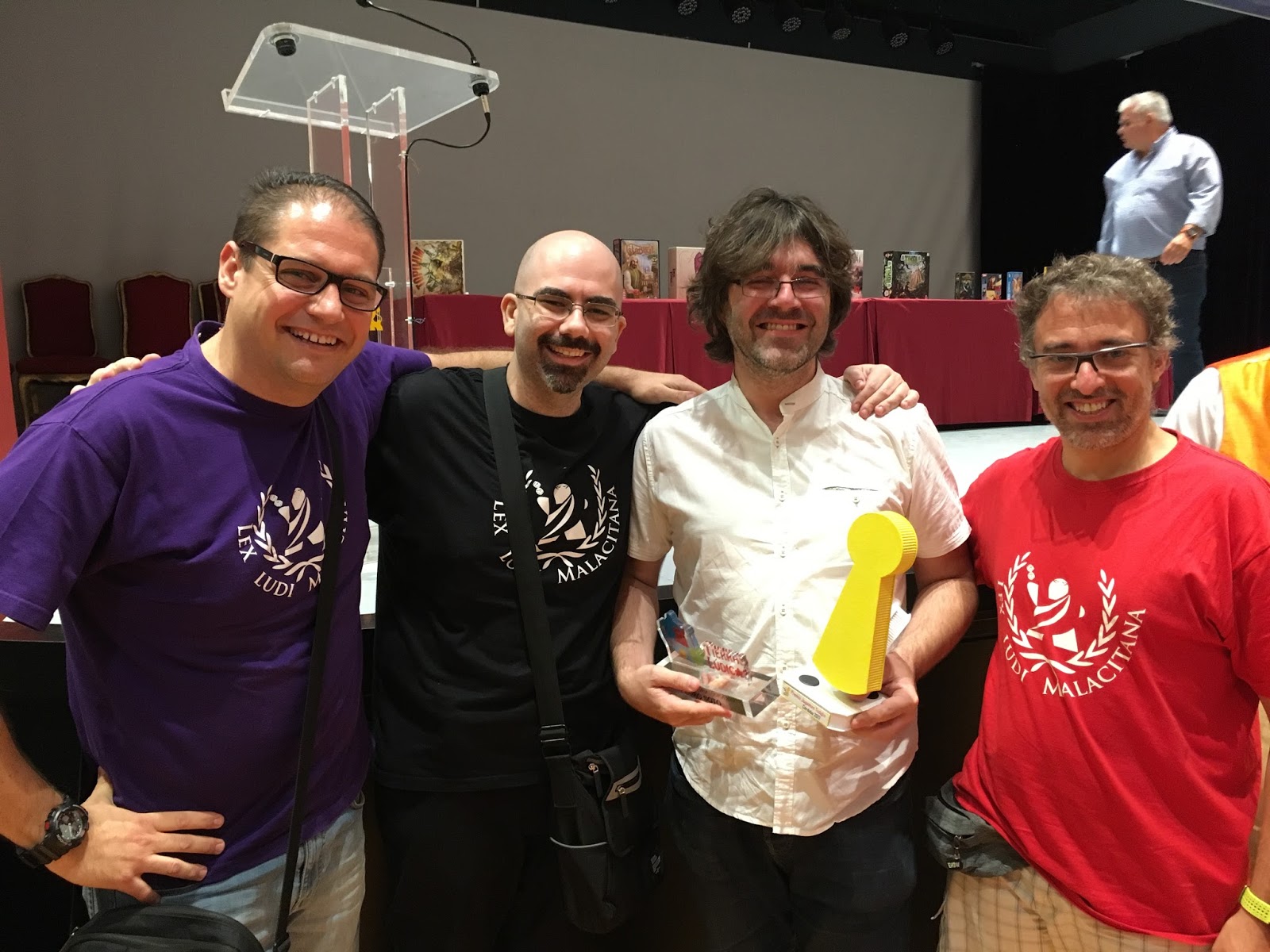Así que el sábado 14 de octubre a muy tempranas horas nos trasladamos a la Ciudad de la Mezquita y llegamos al Palacio de la Merced justo en los momentos previos a la entrega de premios. Agradecer a Daniel Benavides, maestro de ceremonias de la entrega y creador del magnífico blog y canal de YouTube Tang de Naranja, retrasar el inicio de la entrega unos instantes hasta nuestra llegada. Recordemos que se fallan, entre otros premios, el Juego del Año JdA, que fue para Dice Forge de Asmodee, Premio Jugamos Tod@s que fue para Perepau Listosella por su juego Topoum de Looping Games, y el Premio Prototipia, que organiza, entre otros, el compañero de Lex Ludi Malacitana Antonio Becerra, autor de Time of Soccer, y que este que escribe tuvo el honor de hacer entrega al ganador, José Manuel Fernández por su juego Mal Trago.