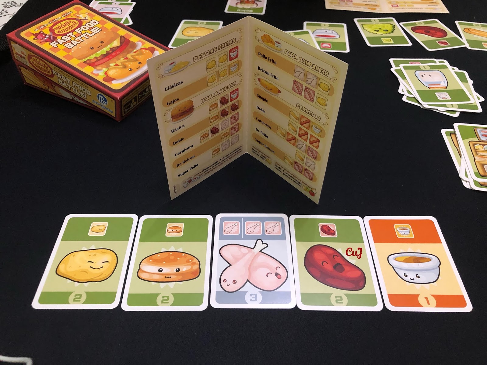 CATCHUP & MOUSETARD: FAST FOOD BATTLE! Un juego de Sergio Herrera editado por MixinGames y distribuido por TCG Factory. De 2 a 4 jugadores, (próximamente con una ampliación a un quinto jugador), a partir de 6 años de edad y con partidas de 20 a 30 minutos. En el nuevo restaurante de Catchup y Mousetard tenemos que preparar los menús de comida rápida con los ingredientes más saludables y los mejores condimentos. Próximamente publicaremos MicroCuJReseña.