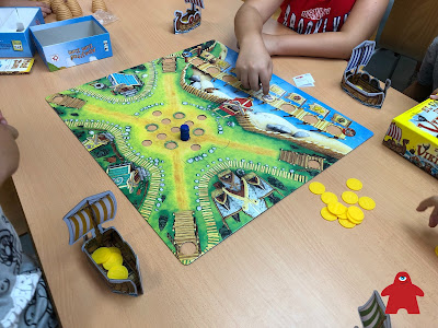-Se sitúan todos los vikingos al principio de la pasarela, incluso si somos menos de 4 jugadores. Igual ocurre con los barcos no elegidos. También introducimos una moneda en su interior.