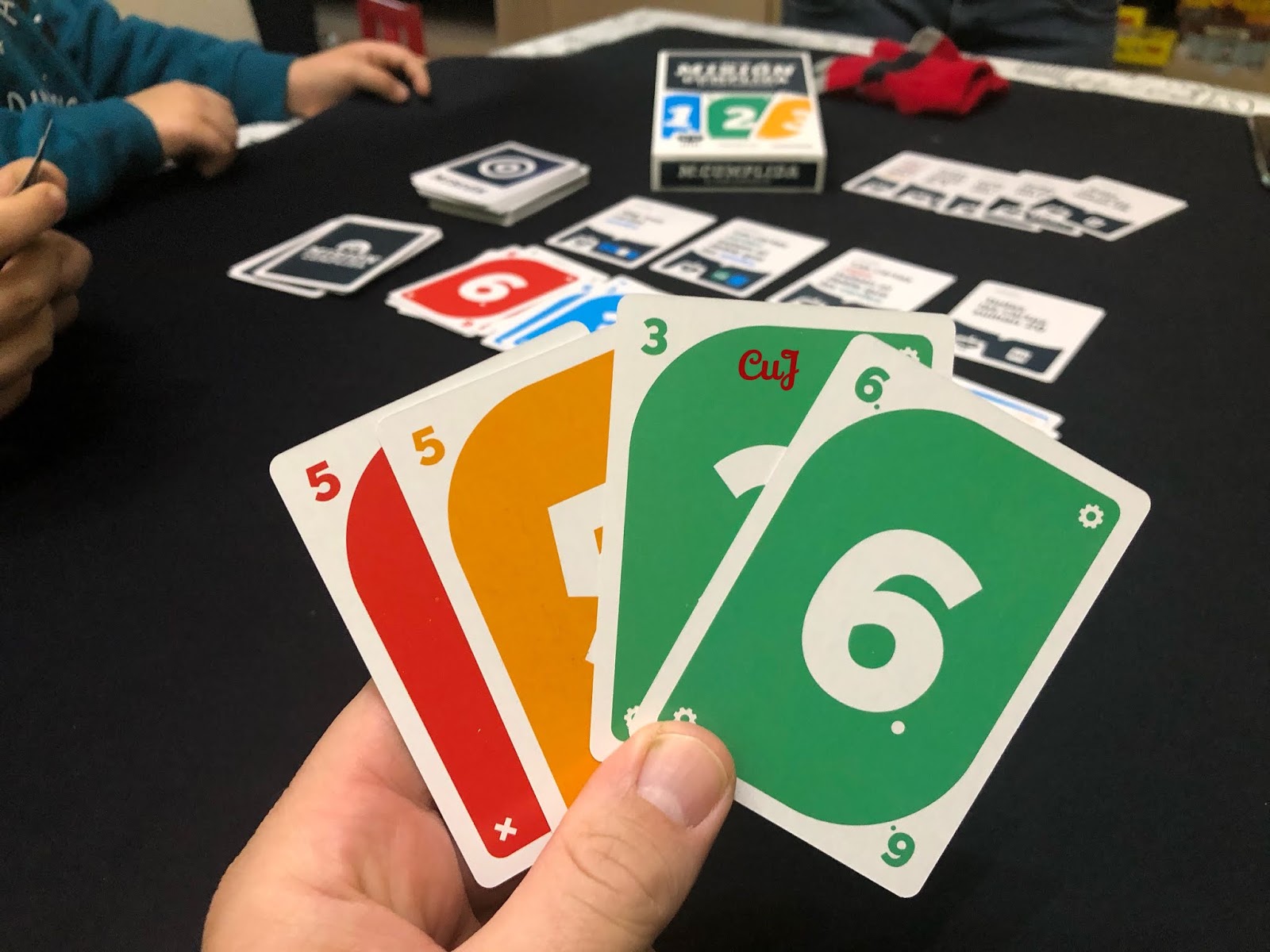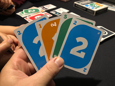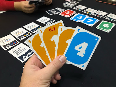 -En nuestro turno, tendremos que jugar 1 carta de nuestra mano sobre una de las pilas de cartas numeradas. Esta carta tiene que ser del mismo color o del mismo número que la carta de la pila en la que la queremos colocar. A continuación robamos una carta del mazo de cartas numeradas.