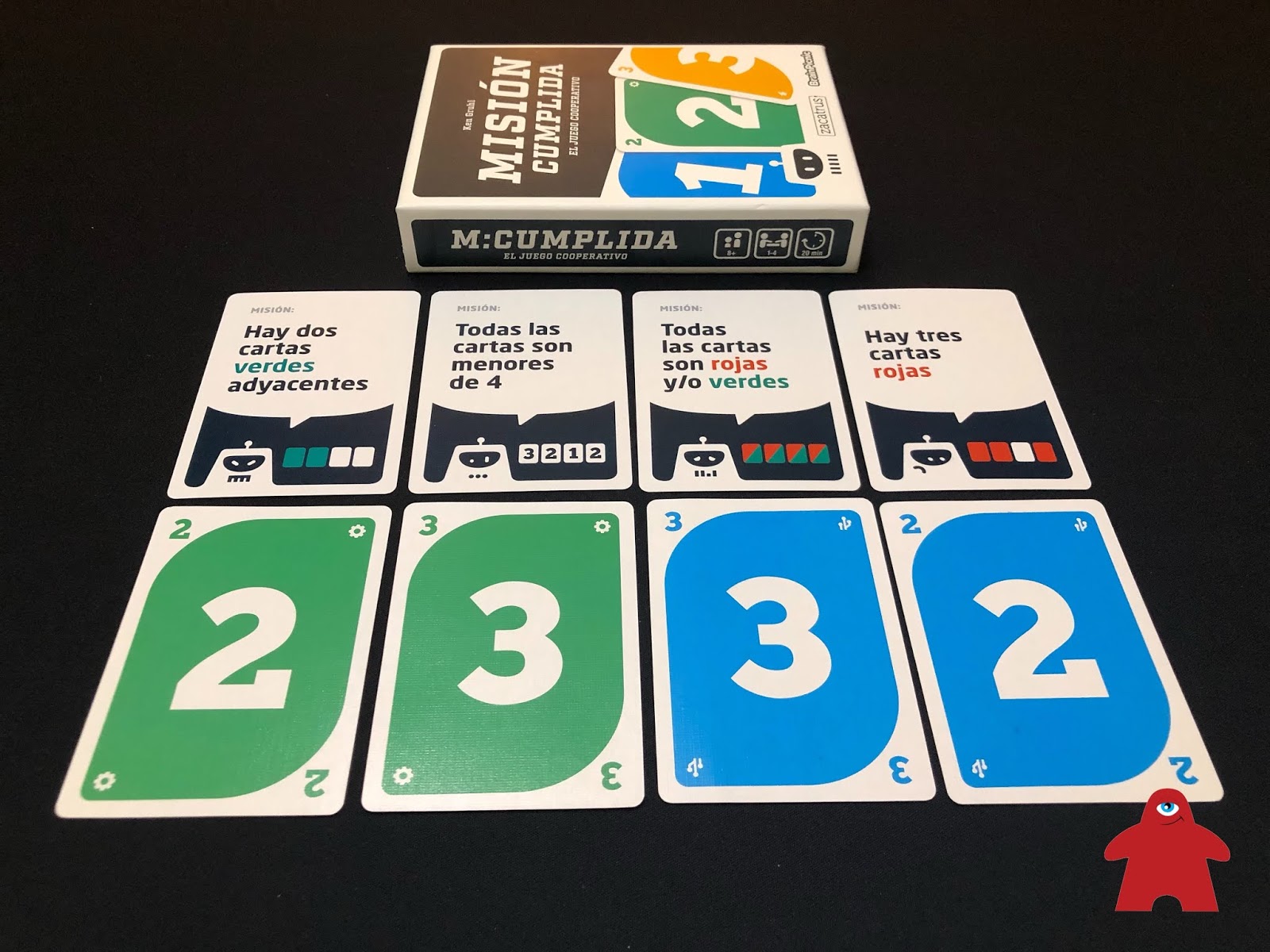 -Un tema importante. Hemos comentado que Misión Cumplida es un juego cooperativo, sin embargo no podemos desvelar nuestra mano al resto de jugadores. Sí podemos sugerir al resto de jugadores que no coloquen en una pila en concreto porque tenemos la carta para cumplir una determinada misión.