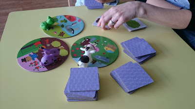 -.En una de las mesas pusimos dos juegos de DJECO: Little Association y Mini Nature. Con el primero identificamos los elementos que van saliendo en las losetas en cada una de los tres tableros circulares, y en el segundo hicimos agrupaciones de familias de animales dependiendo del entorno donde viven. Con ello despertamos en ellos los primeros esbozos para fomentar el razonamiento lógico.