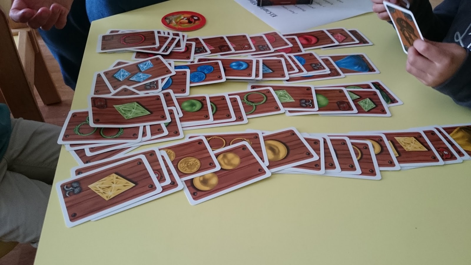 -Jugamos también a Capitán Flint, del autor español Josep María Allué y editado por Viravi Editions, pero adaptando su reglamento a los niños del taller. Ya lo habíamos probado en casa con Lucas y Héctor y pensamos que podía funcionar en taller, cosa que así fue. Cogimos sólo los sacos de colores y ellos fueron capaces de agrupar los tesoros por colores, cada uno en su saco correspondiente.