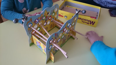 -Jugamos a A la Chita Callando de HABA, un juego destinado a niños un poco más grandes, pero en el taller conseguimos que además de identificar los colores de los dados y relacionarlos con los círculos que tenían que atravesar con los palitos, lo intentaran hacer de manera que no sonaran los cascabeles. Para ello sólo les hicimos tirar un dado, de manera que introducían el palito por el correspondiente a uno de los lados, y que saliera por el agujero de la otra zona por el color que ellos quisieran. Les encantó, y trabajamos la precisión en los movimientos.