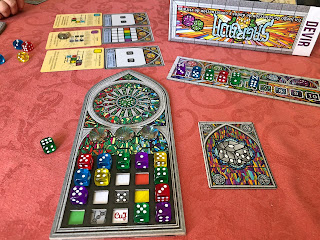 Un juego de Daryl Andrews y Adrian Adamescu editado por Devir Iberia, de 1 a 4 jugadores y una edad recomendada a partir de 13 años. (pero hemos comprobado que con 9 años lo pueden jugar y comprender perfectamente). El objetivo del juego es seleccionar de manera adecuada diferentes dados de colores para poder construir el mejor y más vistoso vitral, cumpliendo unas reglas de colocación dependiendo del color y la cifra de los dados.