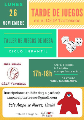 Este curso 2018-2019 hemos llegado a un acuerdo con el AMPA del CEIP Tartessos de Málaga para hacer talleres de juegos de mesa en sus instalaciones. Y el pasado lunes 23 de noviembre fue el turno del primero para alumnos de la línea de Infantil del centro, (de 3 a 5 años). Para ello realizamos una selección adecuada de juegos siguiendo el criterio de anteriores talleres nuestros y el asesoramiento de Efecto Lúdico, (Bebé a Mordor, Aprender Paso a Paso y El Maestro Manu, entre otros), así como las reseñas de Tang de Naranja.