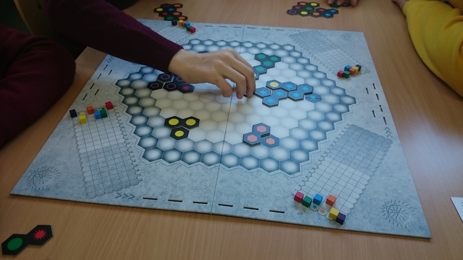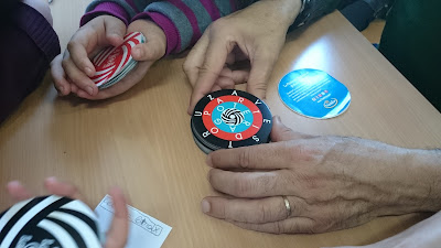 Como novedad en este taller introducimos uno de los juegos que más teníamos ganas de utilizar, Gracias a Devir Iberia jugamos a Genial, del aclamado autor de juegos Reiner Knizia, y que fue Spiel des Jahres 2004. Genial es un juego abstracto en el que disponemos de losetas compuestas con dos hexágonos con diversas formas y cada una asociada a un color. Tendremos que ir colocando en el tablero estas fichas para hacer combinaciones y conseguir puntos. Cada forma con su correspondiente color tendrá un track de puntuación. La novedad de Genial radica en que al final de la partida se tomará como referencia la forma y color que menor hayamos puntuado. De los jugadores el que más haya avanzado en esa línea de puntuación más baja será el ganador. Es un juego en el que el razonamiento lógico unido a una buena estrategia serán vitales para poder ganar la partida. Genial nos encanta y por supuesto os recomendamos. No debe faltar en ninguna buena ludoteca. Aquí podeís leer la mejor reseña posible de este juego, realizada por Misut Meeple.